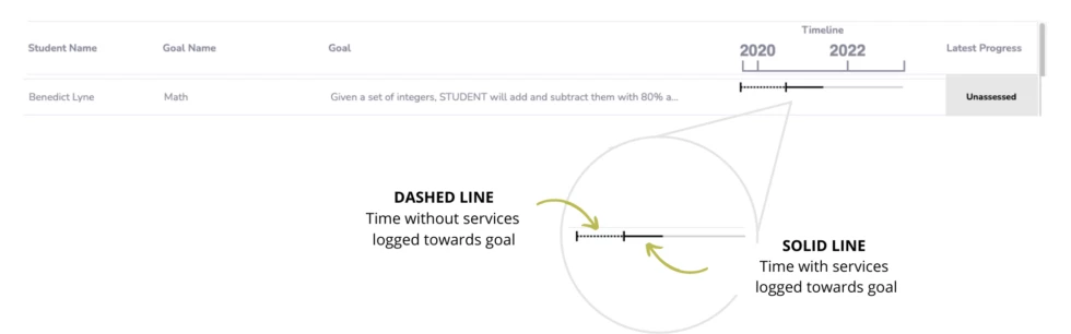 Look at the timeline. You will see a line that’s partially dashed and partially solid. The line represents the duration of the IEP goal. Pay specific attention to the dashed element of the line – the amount of time that has passed since the beginning of the IEP goal without services logged towards that goal. The solid part of the line is when services began being logged toward the IEP goal. If you’re seeing many dashed lines, it’s time to check in with the provider to see what’s going on.