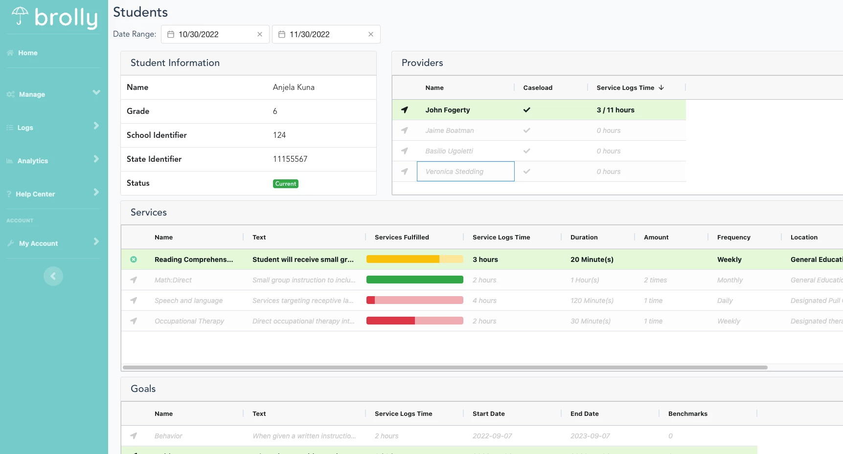 By selecting a student from the dashboard above, an administrator can view the full profile of any student (as seen below). These student level dashboards allow administrators to identify which services are being fulfilled, in accordance with the minutes in the IEP, and which are behind. Brolly makes regular updates to this student detail dashboard, providing a robust look at each student’s service provision, location of service, providers responsible for service, and student progress toward annual goals.