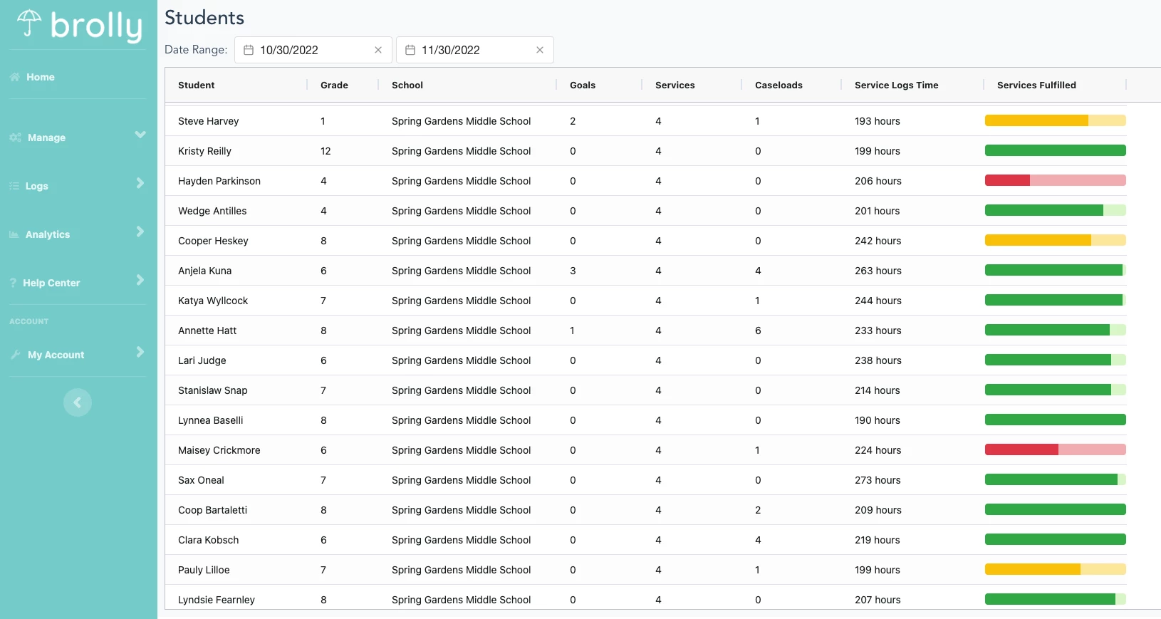 Brolly's Service Fulfillment Tracking feature provides insight into student services and compares delivered service minutes to required minutes, as pulled from the IEP. As providers track services in Brolly, administrator dashboards reflect real time progress toward each students' required minutes. Administrators can quickly identify if minutes are not being met and address any potential gaps in services. The dashboard can be filtered by various data points - school, grade level, % service fulfillment and more.